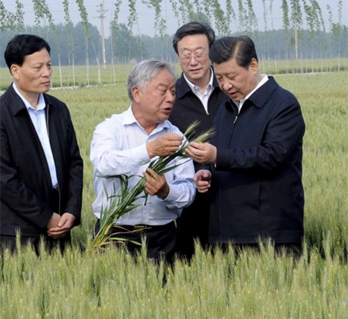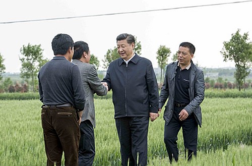 習(xí)近平在尉氏縣張市鎮(zhèn)高標(biāo)準(zhǔn)糧田察看小麥長勢。(圖片來源:新華視點)