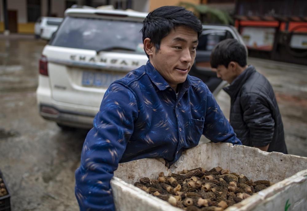 云南貢山縣獨(dú)龍江鄉(xiāng)龍?jiān)濉爸赂荒苁帧焙蜁杂涝卩l(xiāng)里賣羊肚菌(2019年4月19日攝)。 新華社記者 江文耀 攝