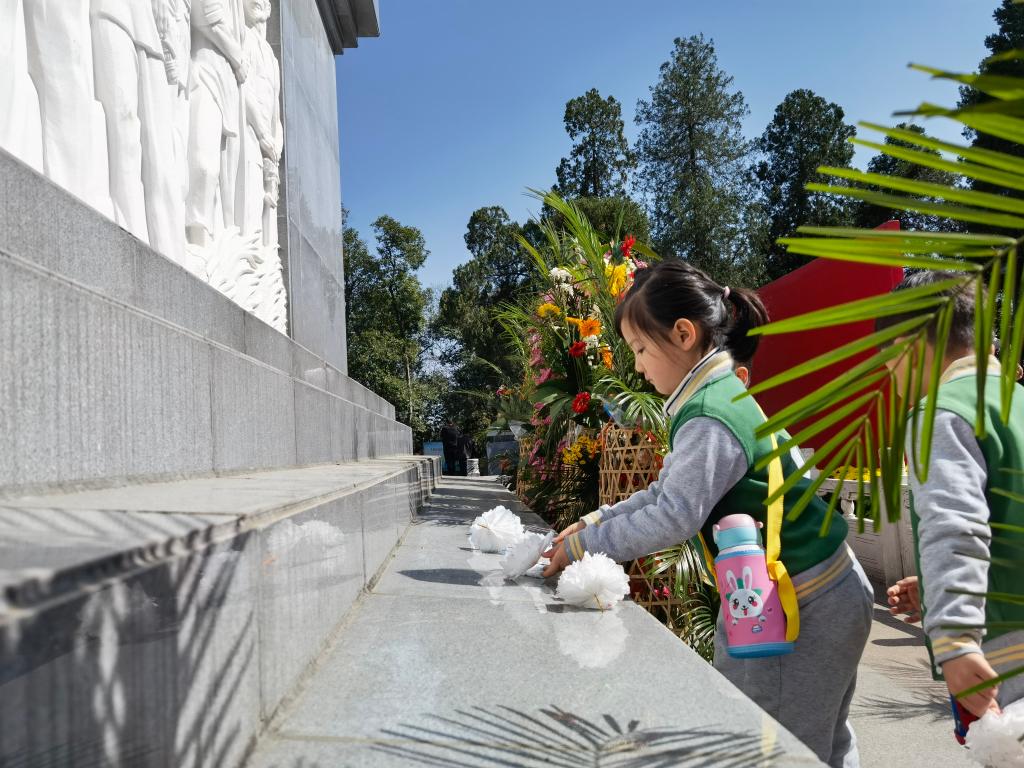 3月24日,當?shù)赜變簣@的小朋友向革命烈士紀念塔獻上自制的紙花。(新華社記者陳諾 攝)