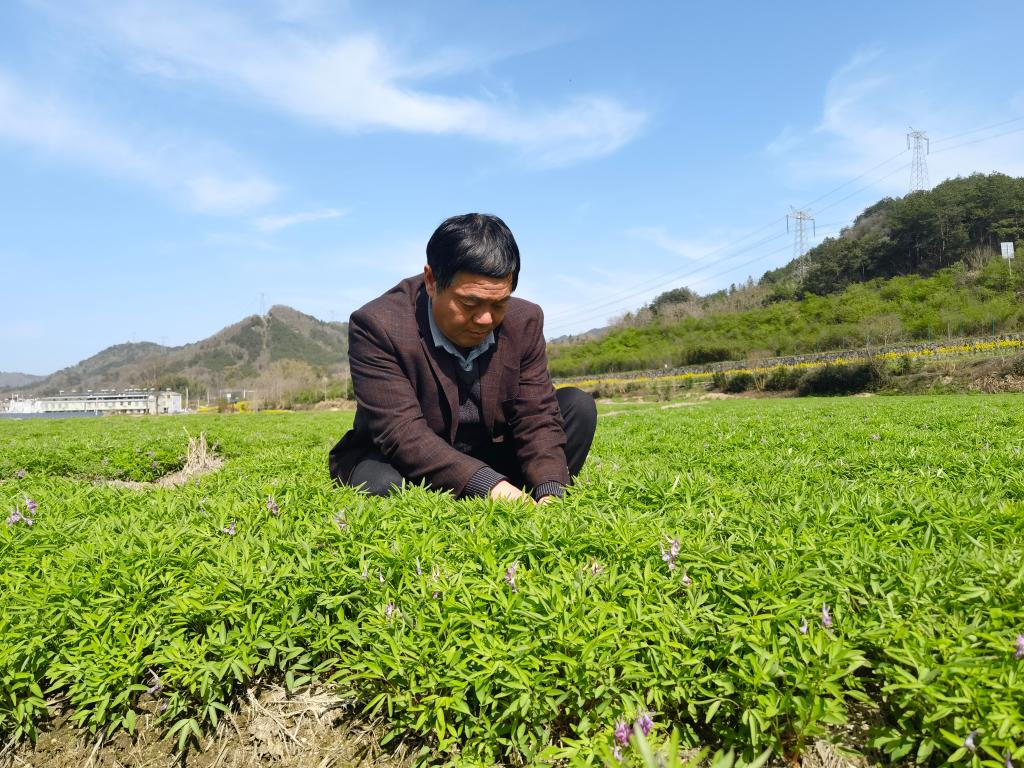 3月24日,羅先平在地里查看元胡長勢。(新華社記者陳諾 攝)