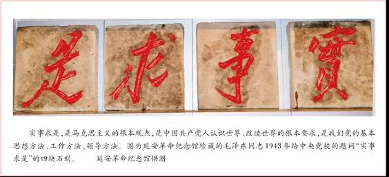 延安革命紀(jì)念館有四塊鎮(zhèn)館之寶,就是毛澤東同志在1943年給中央黨校的題詞“實事求是”的四塊石刻,每塊石刻長70厘米、寬63.5厘米、高14.5厘米。