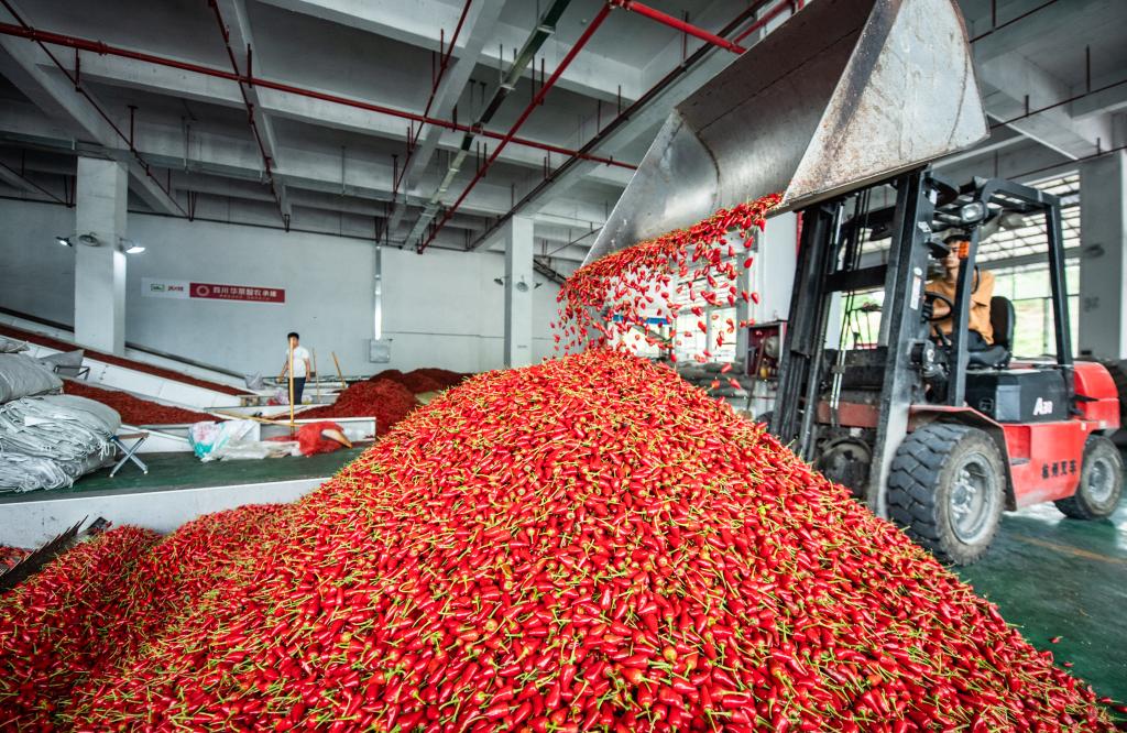 工人在遵義市新蒲新區(qū)一家辣椒加工企業(yè)內(nèi)轉(zhuǎn)運辣椒(2020年8月13日攝)。新華社記者陶亮攝