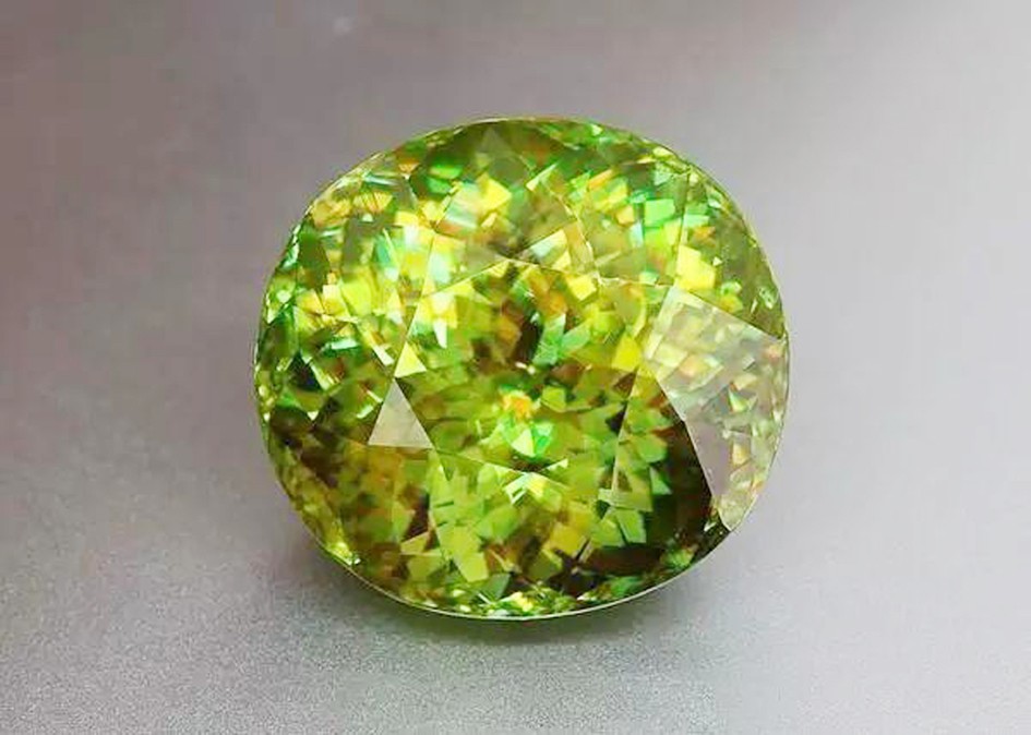榍石是極稀少的寶石品種,折射率特別高,光澤特別強,而且色散很高,它能把所接受的光束吸收成碎片形成光怪陸離的顏色。鉆石散發(fā)出的是七彩的閃光,榍石散發(fā)出的是五彩繽紛的強火彩,是一種耀眼的光彩,比鉆石更勝一籌。