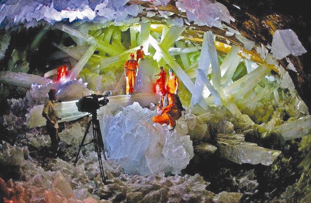晶體生長(zhǎng)的大小與其自身性質(zhì)和形成的地質(zhì)條件有關(guān)。通常情況下,礦物晶體由于受到空間限制,個(gè)體都不是很大,那么如果有足夠的空間與時(shí)間,晶體到底能長(zhǎng)到多大呢?奈卡水晶洞是世界上最大的水晶洞穴,它位于墨西哥奇瓦瓦沙漠奈加山脈下305米深處。其洞穴內(nèi)長(zhǎng)條的晶體是無(wú)水石膏晶體,這些半透明的巨型晶體長(zhǎng)度達(dá)到了11米,重達(dá)55噸,非常巨大。