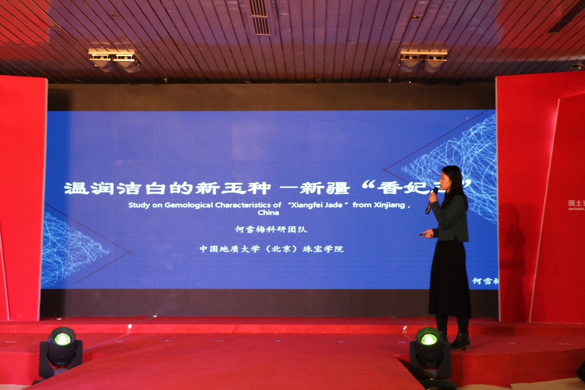 中國地質(zhì)大學(xué)(北京)珠寶學(xué)院何雪梅科研團(tuán)隊(duì)代表潘彥梅現(xiàn)場介紹香妃玉玉石的特點(diǎn)