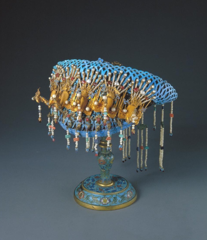 鈿又稱鈿子,是皇后、妃、嬪們平時戴的便帽。這種帽子一般用藤絲編成帽架,也有的在紙板或細(xì)鐵絲上纏繞黑色絲線為胎并編成方格紋、錢紋、盤腸等形式,再用各種寶石、珍珠嵌于帽架上,組成各種吉祥圖案。此鈿子用大珍珠50顆,二、三等珍珠幾百顆,寶石二百余塊,珠光寶氣,珍貴豪華,主要是在吉慶場合和傳統(tǒng)節(jié)日時戴用的。