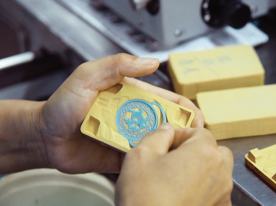 倒模工藝就是要先做一個蠟版,將每個小蠟件分層次地“種”到蠟樹干上,形成一個“蠟樹”。然后將蠟樹放入裝有石膏粉和水的鋼拎中,并用抽真空機(jī)進(jìn)行抽真空,再將石膏模放入烤箱中進(jìn)行烘干,除去鋼拎內(nèi)的蠟件。此時,蠟樹已經(jīng)完全融化,石膏模制作完成。