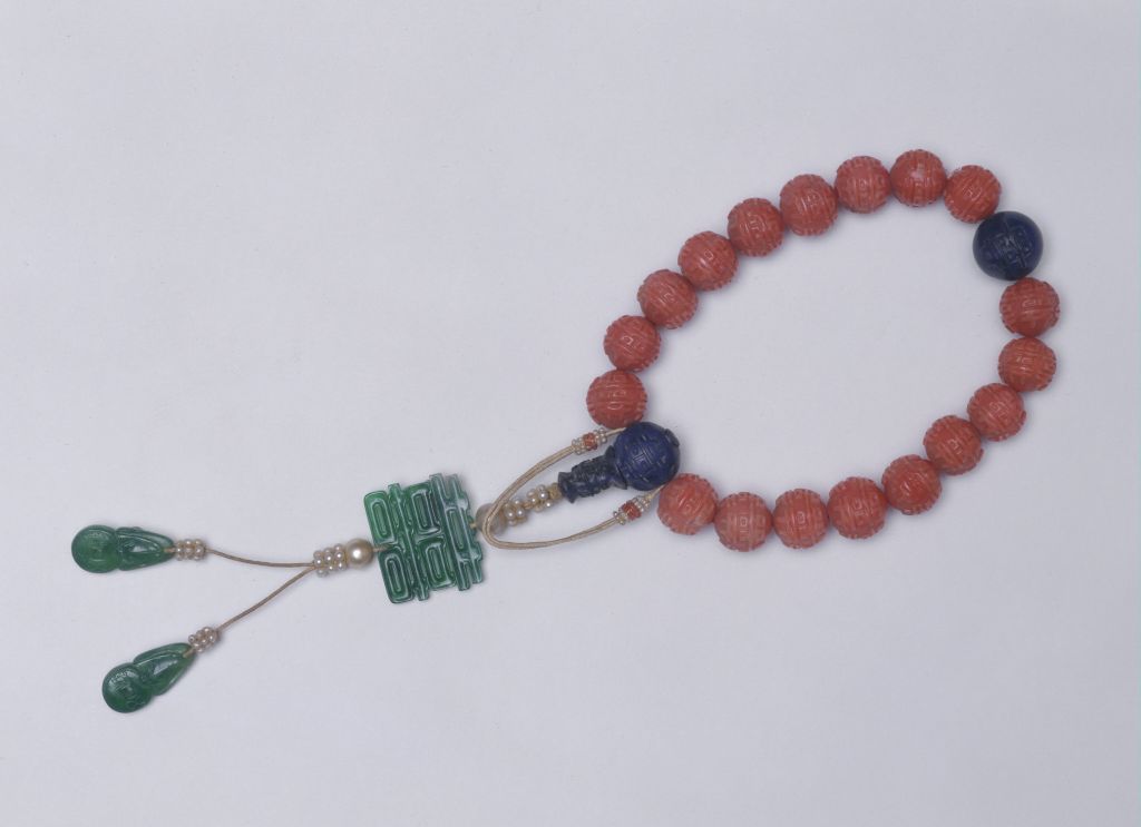 手串以十八顆珊瑚珠串成,以青金石佛頭、結珠及翡翠墜為飾。手串雕工精細,雕刻四面“囍”字的珊瑚珠與兩面“囍”字的青金石佛頭、結珠,使本來不甚鮮亮的珠體倍加耀眼;翠墜角雖小,但也是將雕刻發(fā)揮到了極致,將一只蝙蝠口銜“五銖”錢幣的動態(tài)雕琢得栩栩如生,并具有“福在眼前”之吉祥寓意。此為清代后妃首飾。
