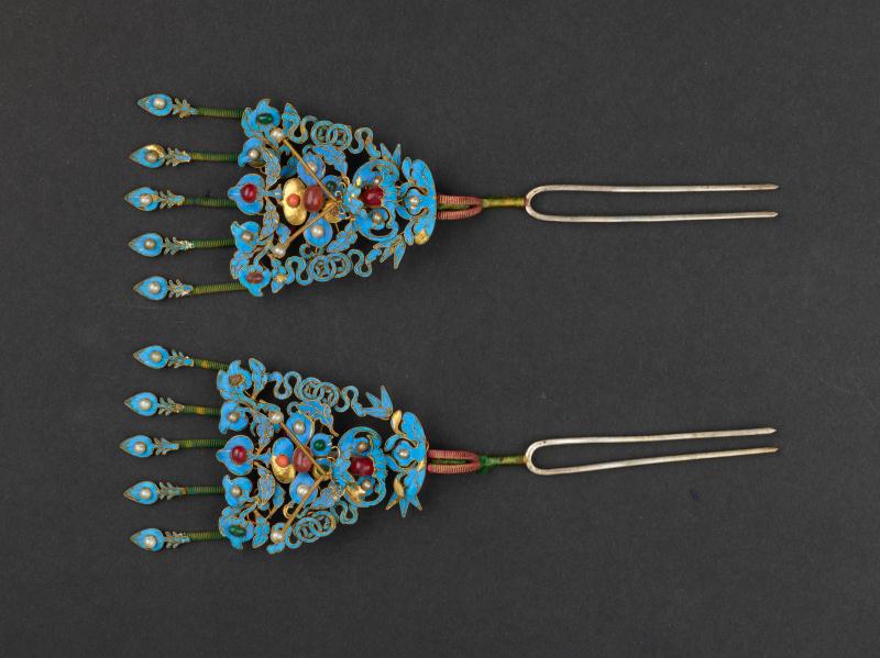 點翠嵌珠福壽紋銀釵,清代,孔府舊藏,現(xiàn)藏于孔子博物館。銀質(zhì)鎏金;以點翠工藝飾蝙蝠、壽桃、雙錢、竹葉、花卉等紋,鑲嵌各色寶石裝飾。寓意福祿萬代,福至眼前。