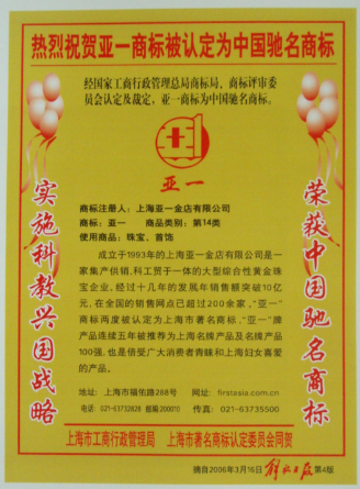 亞一在歷史的道路上不斷前行,亞一品牌在滬上及全國(guó)已享有聲譽(yù),不僅在競(jìng)爭(zhēng)激烈的行業(yè)中,憑借精湛的工藝屢獲殊榮。同時(shí),作為黃金珠寶行業(yè)的知名企業(yè),亞一與社會(huì)各界保持著良好的公共關(guān)系,中國(guó)珠寶玉石首飾行業(yè)協(xié)會(huì)(GAC)、中國(guó)商業(yè)聯(lián)合會(huì)、中國(guó)黃金報(bào)社、上海黃金飾品行業(yè)協(xié)會(huì)等多個(gè)行業(yè)協(xié)會(huì)及傳媒頒發(fā)的品牌獎(jiǎng)項(xiàng)。