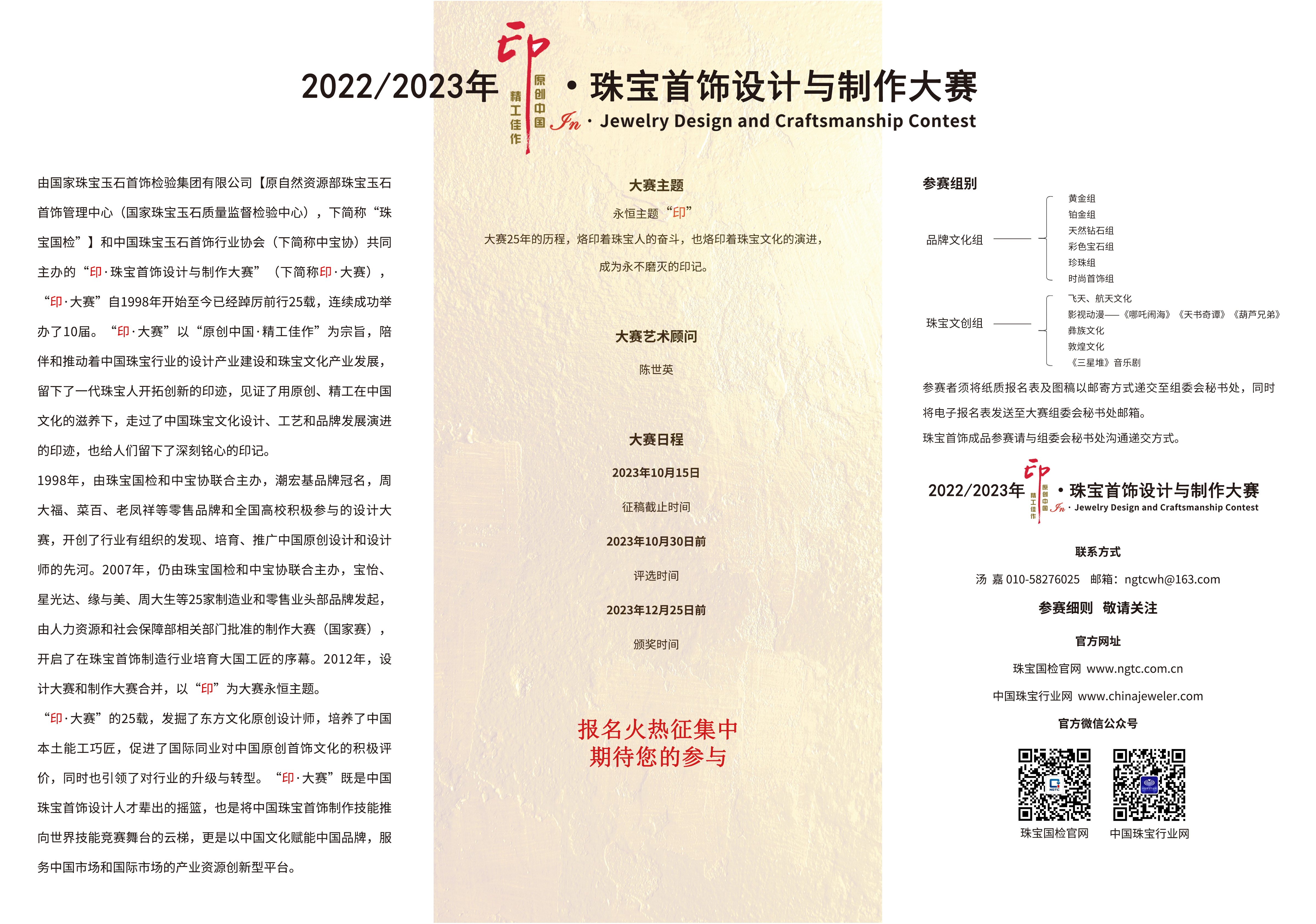 由國家珠寶玉石首飾檢驗集團(tuán)有限公司【原自然資源部珠寶玉石首飾管理中心(國家珠寶玉石質(zhì)量監(jiān)督檢驗中心),下簡稱“珠寶國檢”】和中國珠寶玉石首飾行業(yè)協(xié)會(下簡稱“中寶協(xié)”)共同主辦的“印·珠寶首飾設(shè)計與制作大賽”(下簡稱“印·大賽”),自1998年開始至今已經(jīng)踔厲前行25載,連續(xù)成功舉辦了10屆?!坝 ご筚悺币浴霸瓌?chuàng)中國·精工佳作”為宗旨,陪伴和推動著中國珠寶行業(yè)的設(shè)計產(chǎn)業(yè)建設(shè)和珠寶文化產(chǎn)業(yè)發(fā)展,留下了一代珠寶人開拓創(chuàng)新的印跡,見證了用原創(chuàng)、精工在中國文化的滋養(yǎng)下,走過了中國珠寶文化設(shè)計、工藝和品牌發(fā)展演進(jìn)的印跡,也給人們留下了深刻銘心的印記。