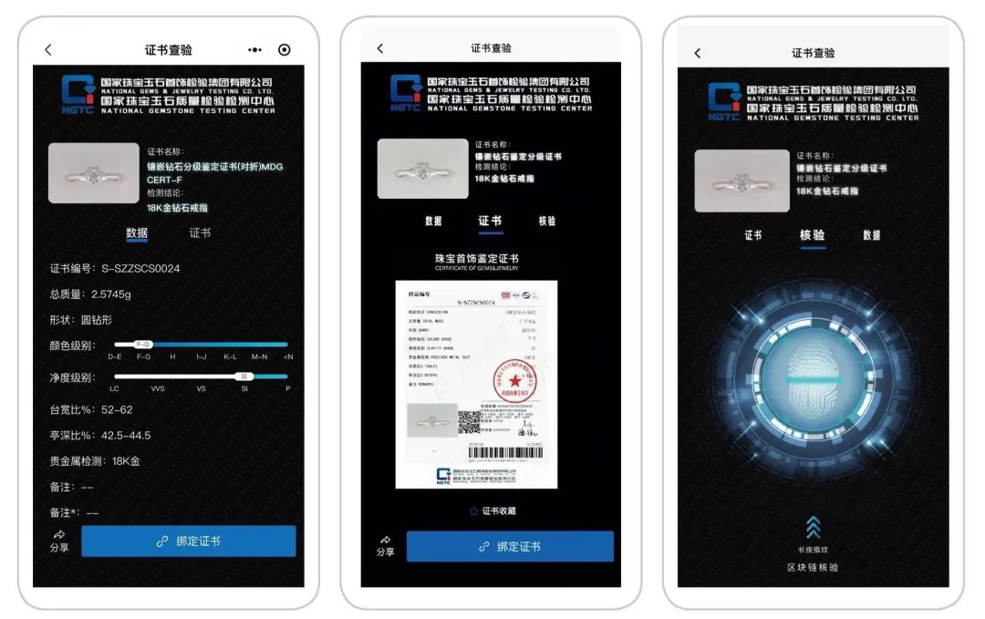 使用珠寶國檢(NGTC)數(shù)字證書后,用戶可以隨時隨地根據(jù)個人需要查閱、分享、展示證書信息。