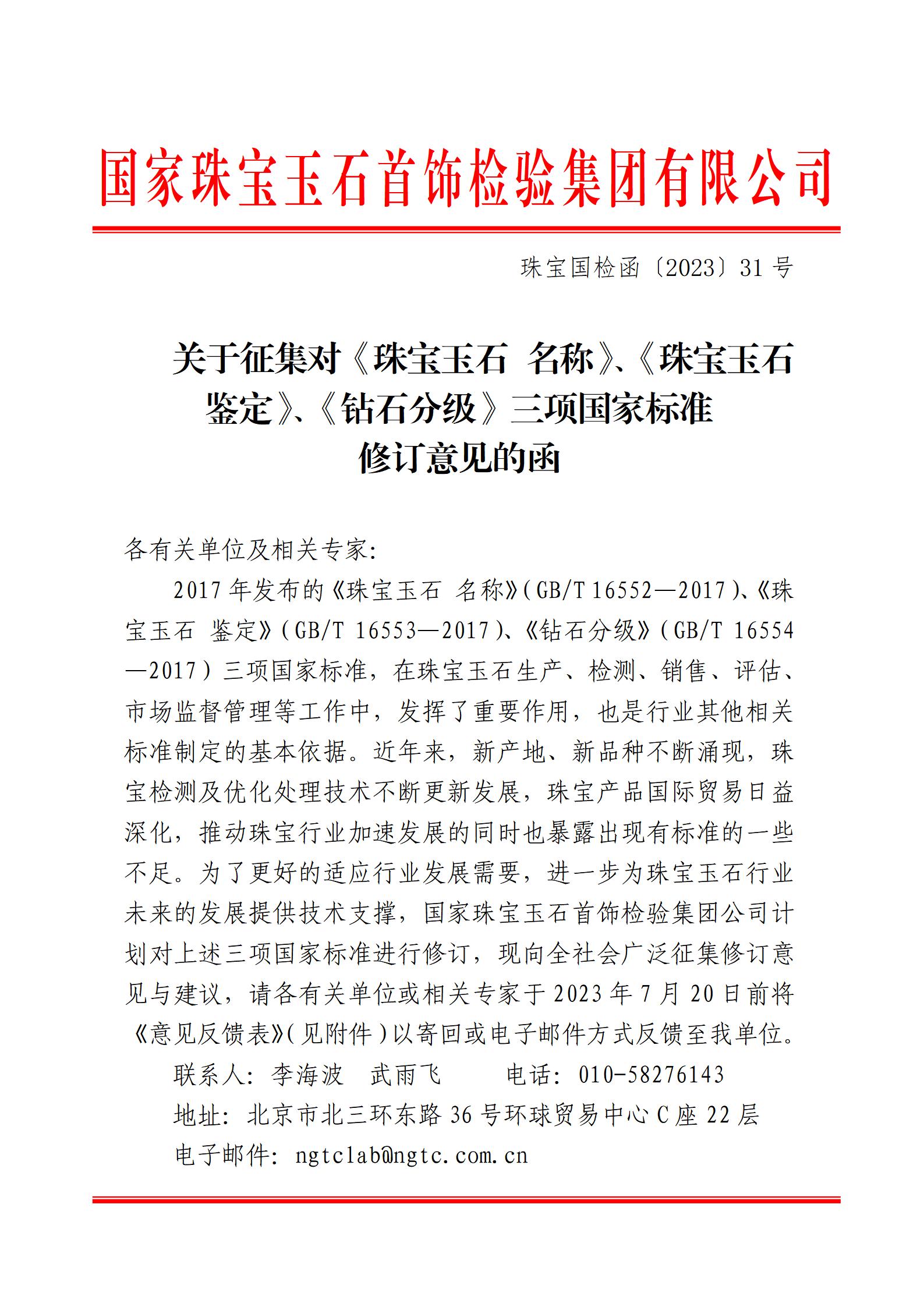 關(guān)于征集對《珠寶玉石 名稱》、《珠寶玉石 鑒定》、《鉆石分級》三項國家標(biāo)準(zhǔn)修訂意見的函