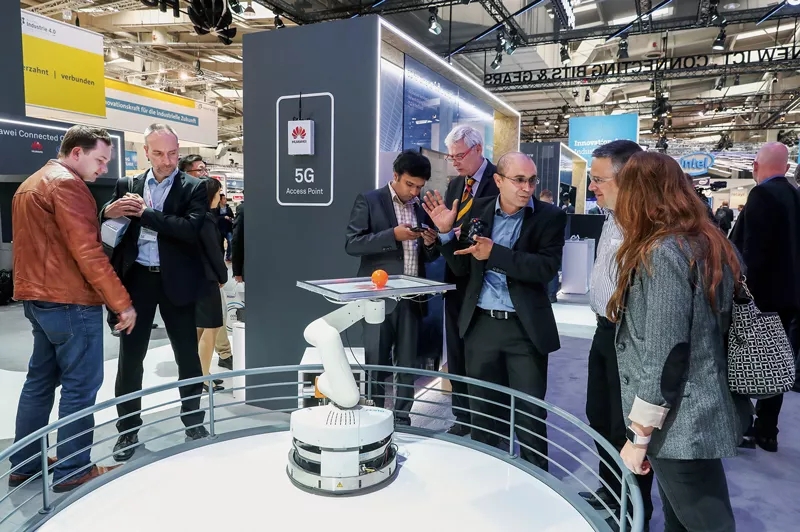 圖為2018年4月24日,在德國漢諾威工業(yè)博覽會(huì)上,參觀者在華為公司展區(qū)觀看運(yùn)用第五代移動(dòng)通信技術(shù)(5G)操控的機(jī)器人。新華社記者 單宇琦/攝