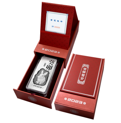 癸卯(兔)年發(fā)行的賀歲銀條規(guī)格共計六種:1,000克、500克、200克、100克、50克和15克,最大發(fā)行量分別為600條、1,500條、3,000條、21,000條、36,000條和10,000條,成色均為99.9%。本套銀條在延續(xù)經(jīng)久不衰的生肖主題的同時,秉承一貫的設(shè)計和工藝風(fēng)格,采用鏡面、浮雕、噴砂等先進工藝,線條細(xì)膩、層次分明,既具有收藏投資價值,又具有藝術(shù)觀賞價值,是一款值得入手的藝術(shù)藏品。