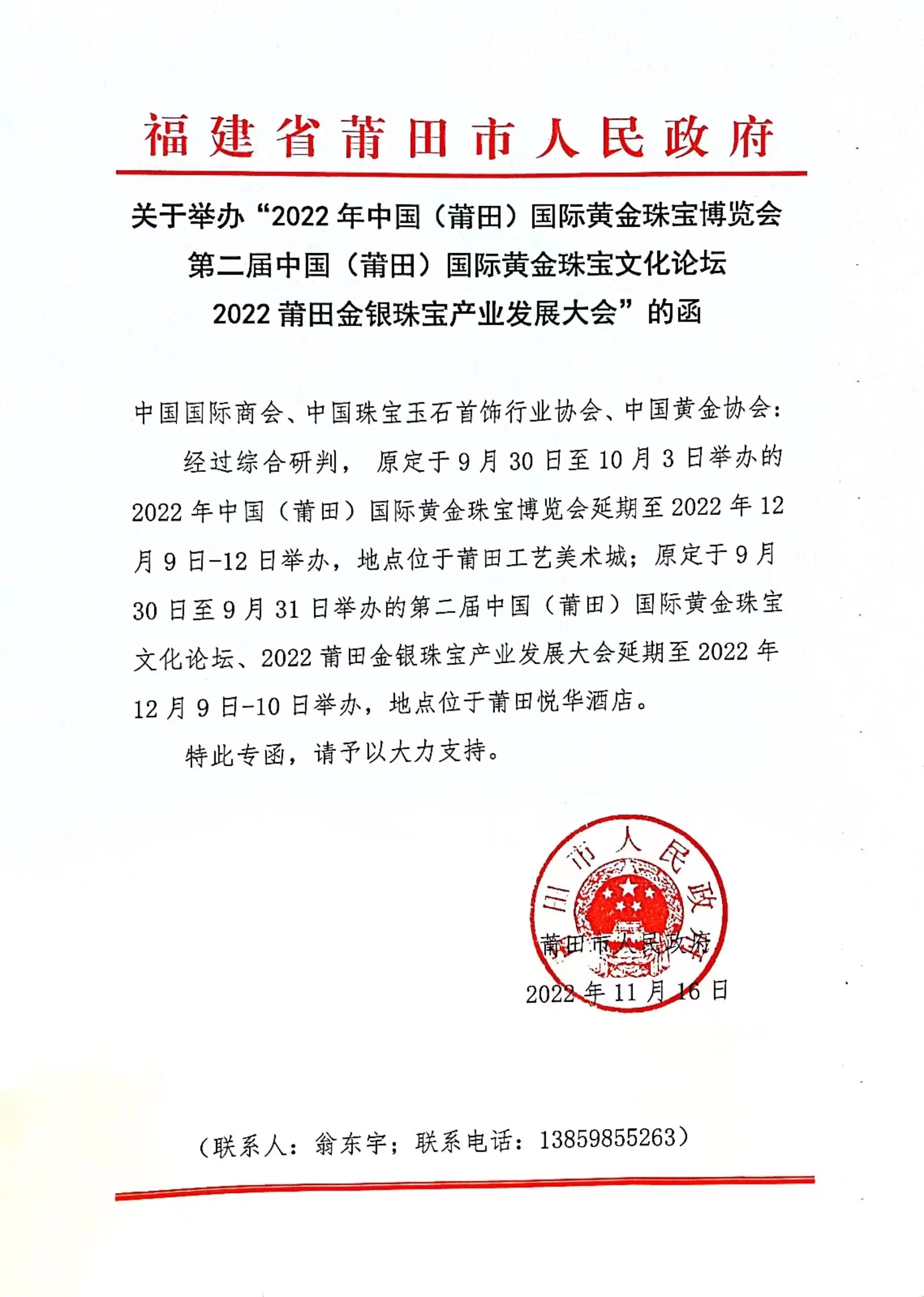關(guān)于舉辦“2022年中國(guó)(莆田)國(guó)際黃金珠寶博覽會(huì)”的通知